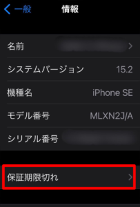 このiPhoneは残念ながら「保障期限切れ」と表示されてますので、AppleCare+には未加入と言うことが確認できます!