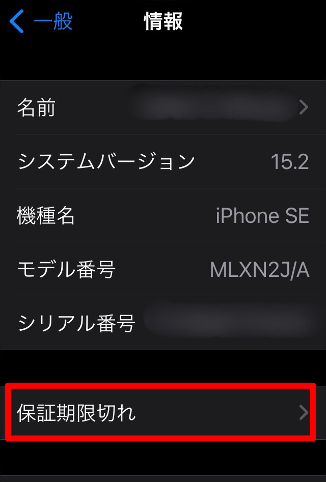 このiPhoneは残念ながら「保障期限切れ」と表示されてますので、AppleCare+には未加入と言うことが確認できます!