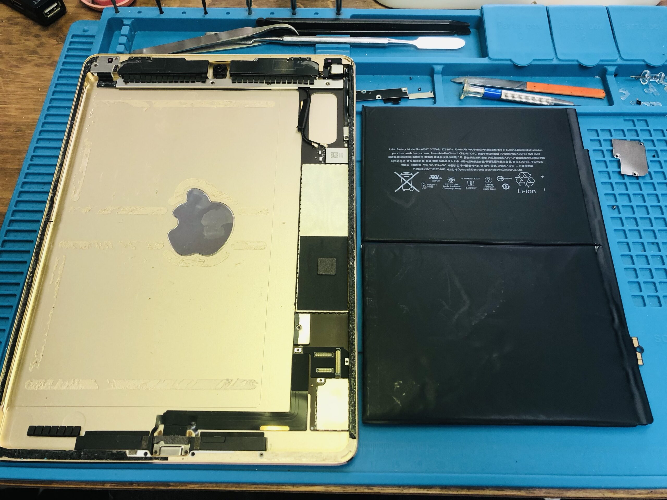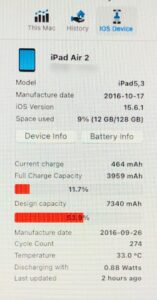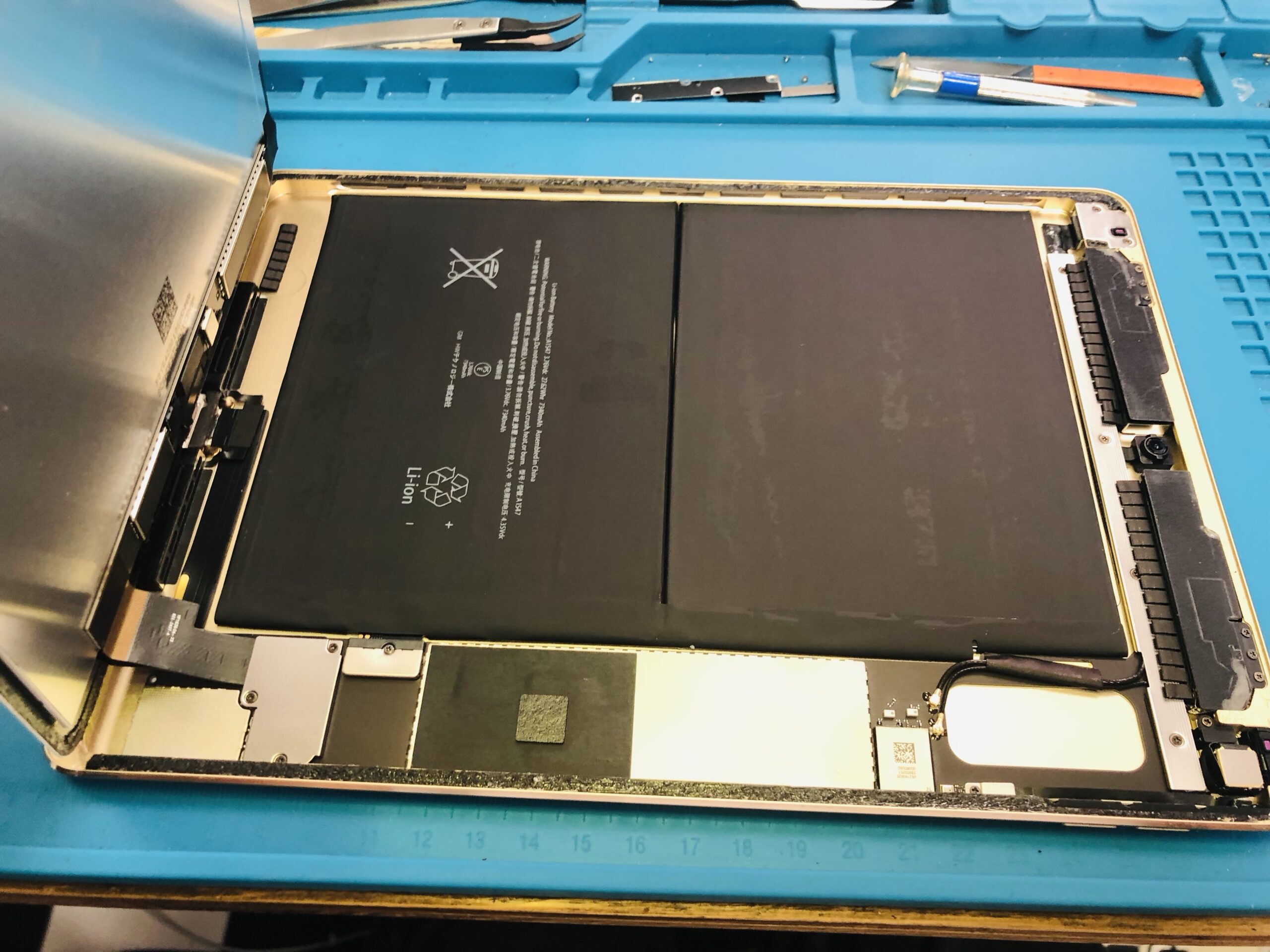 [iPad修理] 江戸川区船堀からご来店 iPadAir2 バッテリー交換 バッテリー交換修理 2022.10.032026.01.03 先日、iPhone修理をされたお客様からの依頼でiPadAir2のバッテリー交換をさせて頂きました! [修理前のバッテリー状態] 最大容量が半分になってるので、これでは全然もたないですよね〜(泣) [作業中 殆どがバッテリー] 写真では分かりづらいですが、膨張もしてました!! [作業中 バッテリー剥がし完了] [作業中 新しいバッテリーに交換] [バッテリー状態 100%] タッチパネルを付けてバッテリーの状態とチャージ確認をします! [修理完了] 動作確認も問題なく無事に修理完了です! ご利用ありがとうございましたm(__)m