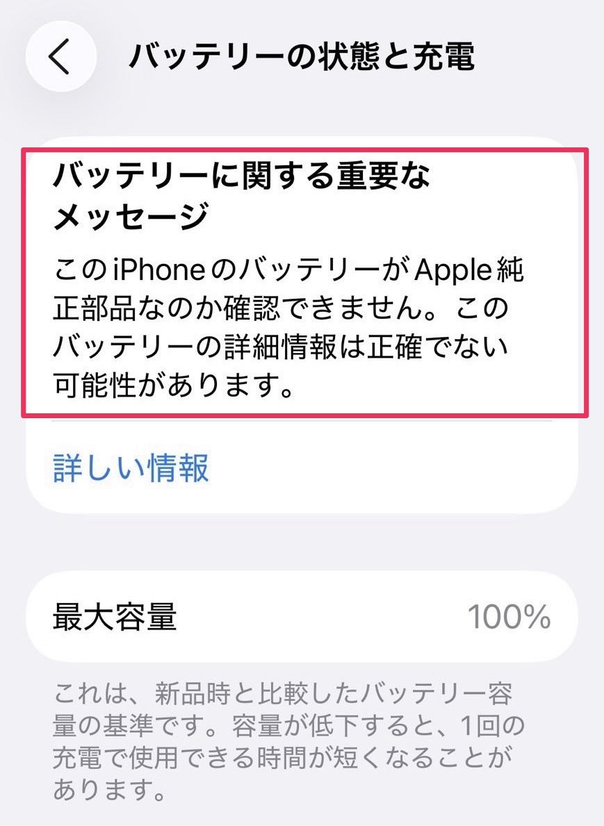 👉 警告は「Apple公式で交換していませんよ」というお知らせにすぎず、危険だから使えないわけではありません。