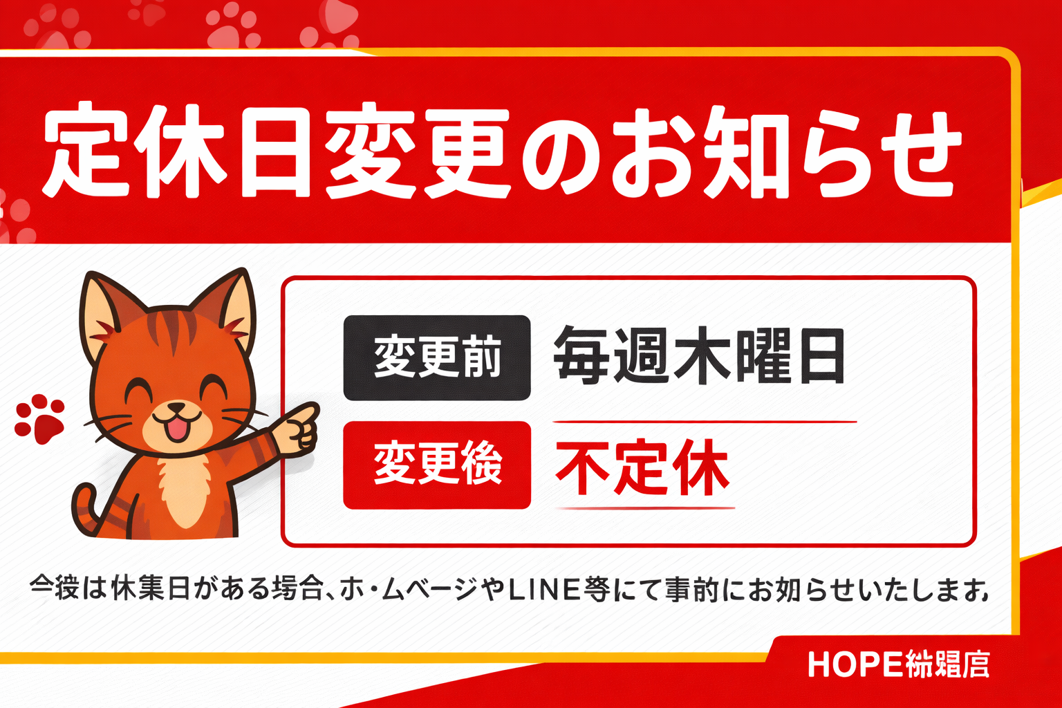 このたび、営業体制の見直しに伴い「不定休」へ変更させていただくことになりました。