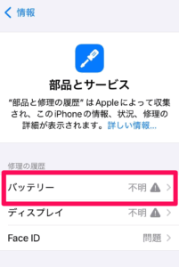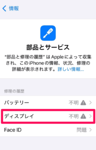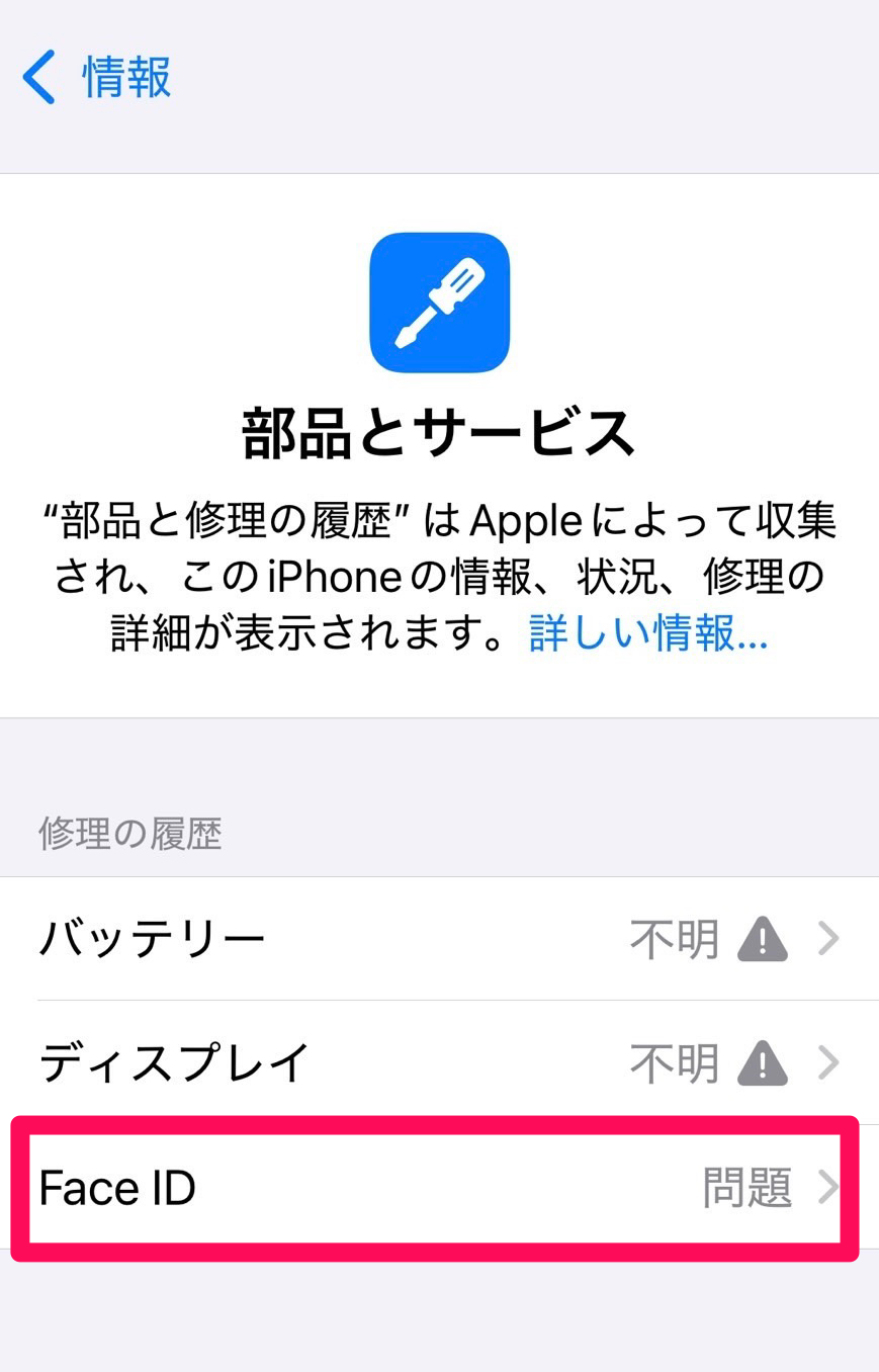 「設定」→「一般」→「情報」→「部品とサービスの履歴」 - iPhoneX以降のインカメラを交換するとFaceIDが使用できなくなります。