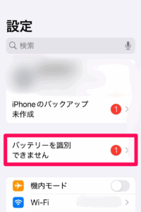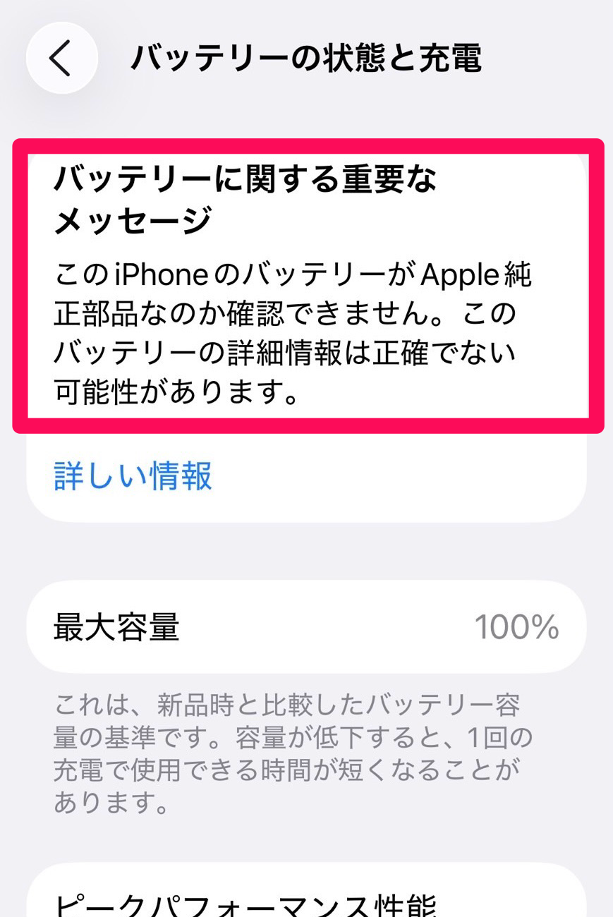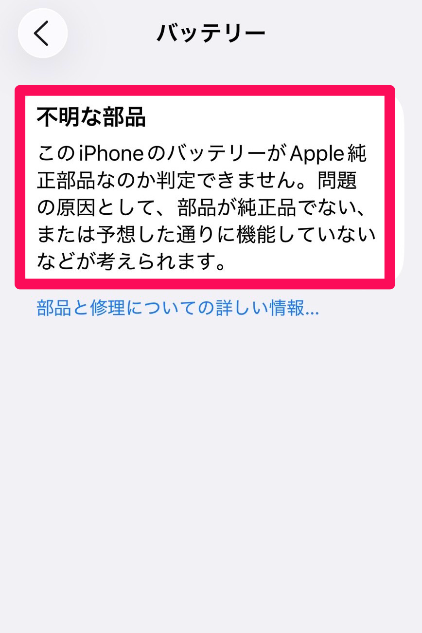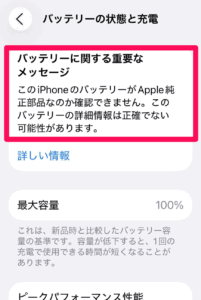 - iPhoneXs以降のバッテリー交換後、警告文がポップアップで表示され最大容量表示が「-」になり、「不明な部品」と表示されます。